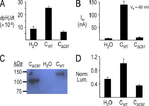Figure 12. Lost activity of CΔC97 expressed in oocytes due to poor expression at the plasma membrane. (A) Summary data of the segment-bc pHi recovery rates from experiments similar to those shown in Fig. 11, top traces. n ≥ 4 for each bar. (B) Summary of H2O-subtraced, HCO3−-induced currents from experiments similar to those shown in Fig. 11, bottom traces. For each bar, n ≥ 6 from two batches. (C) Immunoblot analysis of total microsomal protein from single oocytes injected with H2O, CΔC97 cRNA, and CWT cRNA. An NBCe1 antibody labeled bands of the expected sizes: ∼130 kD for CWT and ∼118 kD for CΔC97. No labeling was observed in protein from an H2O-injected oocyte. (D) The mean normalized luminescence (Norm. Lum.) for oocytes injected with CΔC97 and H2O are similar. n ≥ 10 from two batches of oocyte.