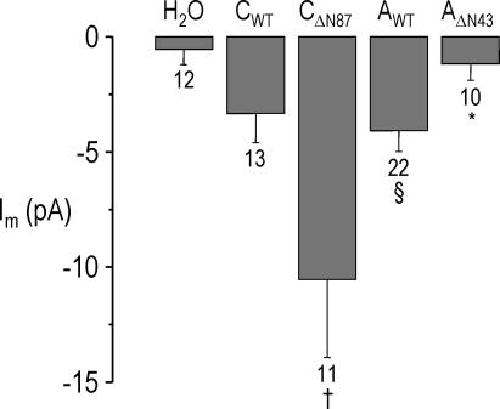 Figure 15. Summary macropatch data from experiments similar to those shown in Fig. 14 on oocytes injected with H2O, CWT, CΔN87, AWT, and AΔN43. The mean HCO3−-induced macropatch current for CΔN87 is 3.2-fold larger than the mean current for CWT (†, P = 0.03). The mean HCO3−-induced currents for AWT and CWT are similar (§, P = 0.32), and both are larger than the mean current seen in H2O-injected oocytes (P < 0.05). The mean current for AΔN43 is 71% smaller than that of AWT (*, P < 0.01). n values are shown under bars.
