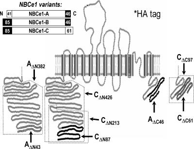 Figure 1. Wild-type and truncated rat NBCe1 variants. NBCe1-A, -B, and -C differ at the amino and/or carboxy termini. The putative membrane topology of NBCe1 is based on mapping of AE1 by Taylor et al. (2001). Truncations examined in this study include hemagglutinin (HA)-tagged NBCe1s with stretches of the cytoplasmic amino or carboxy terminus removed. (Inset, top left) At the amino terminus, NBCe1-A has 41 unique amino acids that differ from 85 amino acids in the B and C variants. At the carboxy terminus, NBCe1-C has 61 unique amino acids that differ from 46 amino acids in the A and B variants.