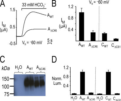 Figure 13. Reduced activity and low surface expression of AΔC46 and CΔC61 expressed in oocytes. (A) 5% CO2/33 mM HCO3− elicited an outward current in an oocyte expressing NBCe1-A (AWT) that was markedly larger than the current in the oocyte expressing AΔC46. (B) Summary of H2O-subtracted, HCO3−-induced currents from experiments similar to those shown in A. n ≥ 6 for each bar from two batches of oocytes. (C) Immunoblot analysis of total microsomal protein from single oocytes injected with H2O, AWT cRNA, or AΔC46 cRNA. An NBCe1 antibody labeled bands of the expected sizes: ∼130 kD for AWT and ∼120 kD for AΔC46. (D) The mean normalized luminescence (Norm. Lum.) for oocytes expressing the truncated NBCs were markedly less than the Norm. Lum. for oocytes expressing the corresponding wild-type NBCs. n ≥ 11 for each bar from two batches of oocytes.