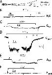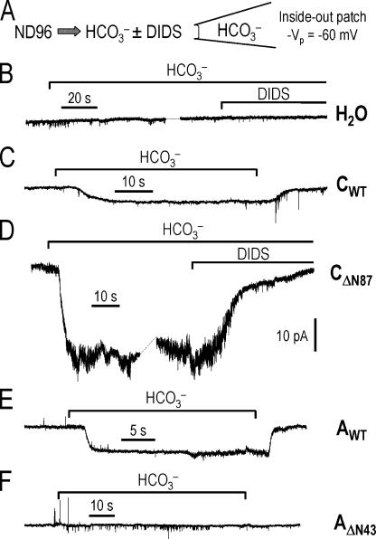 Figure 14. NBCe1 activity from inside-out macropatches excised from oocytes. (A) NBC-mediated inward currents were elicited by exposing patches to a low-Cl−, 5% CO2/33 mM HCO3− solution ± 200 μM DIDS with the patch pipette (−Vp = −60 mV) containing the same low-Cl−, 33 mM HCO3− solution. (B) H2O-injected oocyte. The HCO3− solution without or with DIDS did not elicit any change in current. (C) CWT-injected oocyte. The HCO3− solution elicited a small inward current that was reversible when the patch was returned to ND96. (D) CΔN87-injected oocyte. The inward current elicited by the HCO3− solution was larger than the current seen in C, and completely inhibited by DIDS. (E) AWT-injected oocyte. The HCO3− solution elicited a small, reversible inward current. (F) AΔN43-injected oocyte. No change in current was observed when the patch was exposed to HCO3−.