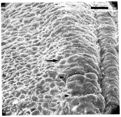 prevalence of larger intercellular spaces and filiform protrusions (pointer). Bar represents