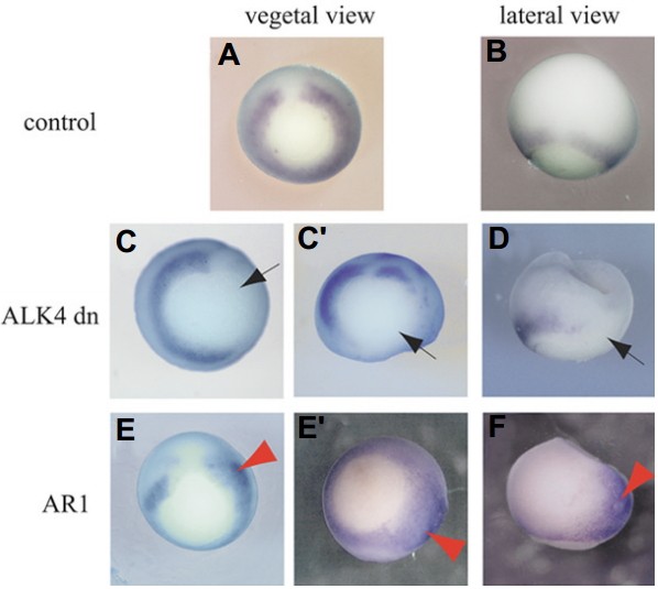 Fig. 2. The effect of Activin-like signaling on Delta-2 expression in vivo. The expression pattern of Delta-2 at stage 11 was examined by whole mount in situ hybridization. (A,B) Uninjected control embryos. (C,C',D) Embryos were injected with 500 pg of ALK4 dn mRNA into one blastomere at the 2- or 4-cell stage dorsally (C) or ventrally (C'). The injection of ALK4 dn mRNA suppressed the expression of Delta-2 on the injection side (black arrow). (E,E',F) Embryos were injected with 200 pg of ARI mRNA into one blastomere at the 2- or 4-cell stage dorsally (E) or ventrally (E'). The injection of ARI mRNA increased the expression of Delta-2 on the injection side (red arrowhead). Vegetal views, dorsal at top (A,C,C',E,E'). Lateral views, animal pole at top (B,D,F).