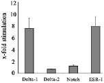 Fig. 3. The expression levels of Delta-1, Delta-2, Notch and ESR-1 in MyoD-injected animal caps. Animal caps were dissected from stage 9 embryos which were injected with 300 pg of MyoD mRNA into animal pole at 2-cell stage, and then cultured for 3 hours. The expression levels of Delta- 1, Delta-2, Notch and ESR-1 mRNA were quantified by real-time RT-PCR. The relative stimulation fold was calculated as the individual expression in MyoD-injected animal caps relative to that in untreated animal caps. The efficiency of cDNA synthesis from mRNA was assessed on the basis of real-time RT-PCR for ODC. The results represent the mean from three independent experiments, and error bars indicate the SEM.