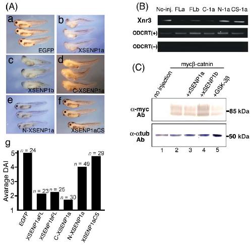 stability by XSENP1s injection. myc-β-catenin (1 ng; lane 2), myc-β-catenin and XSENP1a (1 ng each; lane 3), myc-β-catenin and XSENP1b (1 ng