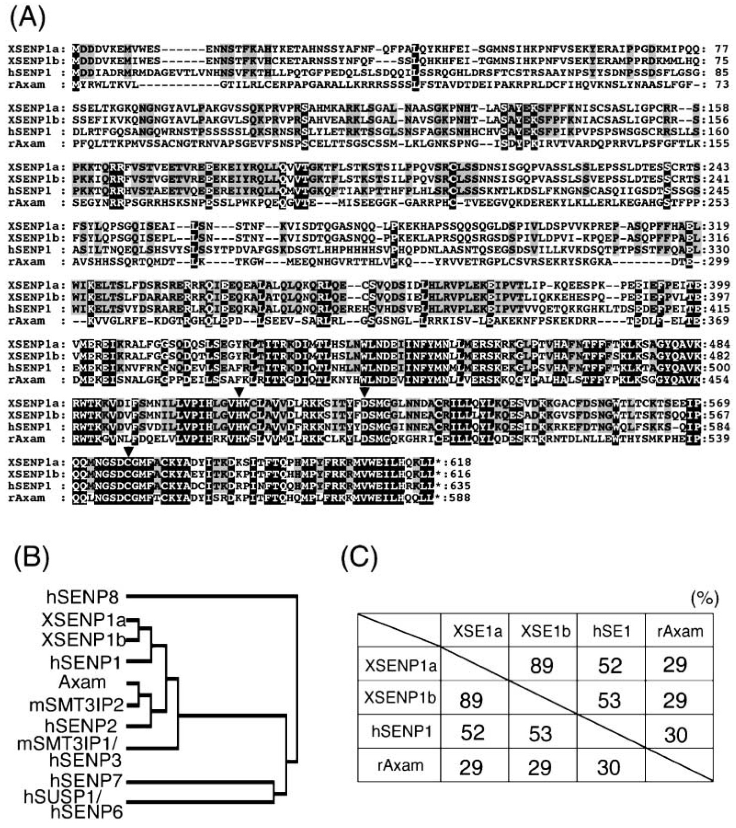 XSENP1s ( XSENP1a, XSENP1b) and hSENP1 are boxed with grey. ( B) Estimated evolutionary relationship of XSENP1s with other