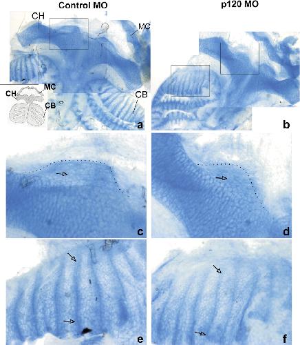 Malformation of the jaws as a result of p120 depletion. Dissected craniofacial cartilage structures stained with Alcian Blue. The inset in (a) shows a schematic of the different craniofacial cartilage structures, including Meckel's cartilage (MC), ceratohyal (CH) and ceratobranchial cartilage (CB). All these structures are still present upon p120 knockdown (b) but are smaller compared with control MO-injected embryos (a). Boxed regions are enlarged in c-f. Higher magnification shows that the ceratohyal cartilage is less dense and delineated in embryos injected with p120 MO (d, see arrow and dotted line) compared with the same area in embryos injected with control MO (c). The same is true for the ceratobranchial cartilage (e,f), where the two arrows point out a ridge that is clearly less dense and composed of fewer cells in p120 MO-injected embryos. |