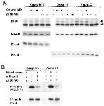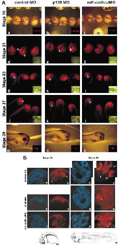 Knockdown of p120 expression results in the downregulation of C- and E-cadherin proteins but not of N-cadherin. (A) An amount of 20 ng or 40 ng of control MO or p120 MO was injected at the 1-cell stage. Embryos were lysed at stages 10.5, 15 and 22 and analyzed for expression of p120 and C-, E- and N-cadherin. Injection of p120 MO leads to a dose-dependent downregulation of p120 (arrow). The strong band indicated by the open arrowhead is nonspecific and serves as a loading control. Next to a loss of p120 expression, lower levels of C-cadherin and E-cadherin can be observed. Levels of N-cadherin are not affected. (B) RNA (500 pg) encoding mE-cadherin or Myc-tagged XN-cadherin was injected at the 1-cell stage together with control MO or p120 MO (20 ng). Embryos were lysed at stages 15 and 17 and analyzed for expression of ectopic mE-cadherin and Myc-tagged XN-cadherin. While the expression levels of mE-cadherin are dramatically reduced upon the co-injection of p120 MO, the levels of ectopic XN-cadherin are not affected. |