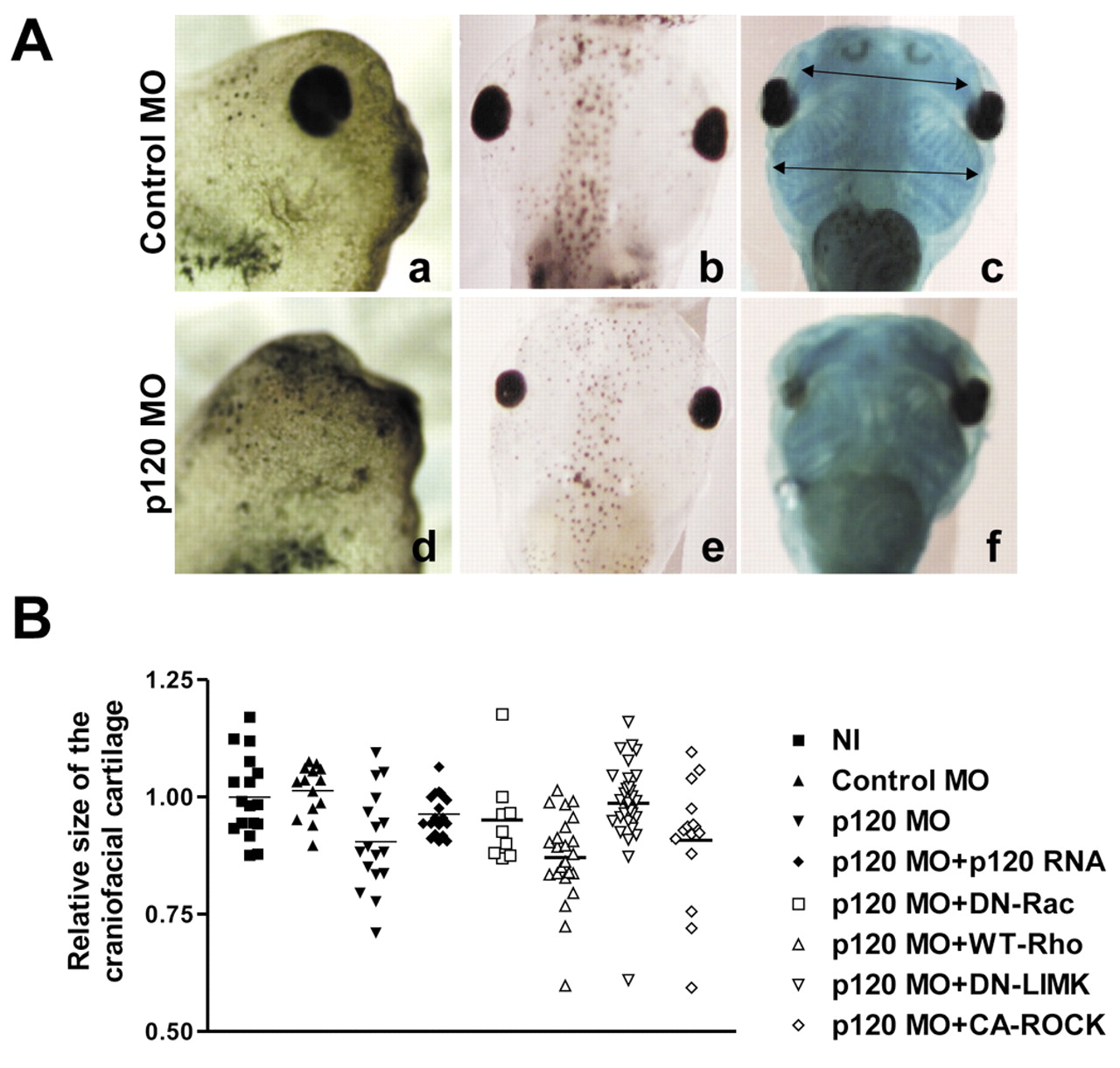 Expression of p120 morpholino (MO) affects the size of the eyes and cartilage. (A) Injection of p120 MO at 8- to 16-cell stage in the region that gives rise to the head results in the formation of smaller eyes or their complete loss (d,e) compared with control MO-injected embryos (a,b). Tadpoles are shown alive at stages 33 (a,d) and 42 (b,e), or fixed and stained by Alcian Blue to reveal the cartilage structures at stage 46 (c,f). Next to smaller or absent eyes, embryos injected with p120 MO also show smaller craniofacial cartilage structures (f) compared with control MO-injected embryos (c). (B) Graph representing the effect of p120 MO on the size of the craniofacial skeleton. For clarity of the figure, representative experiments are shown. The width of the head was calculated by taking the sum of both arrows indicated in A,c. Values were divided by the average value of non-injected embryos. The head size of embryos injected with p120 MO is statistically different from that of the control population (P=0.0068, Student's t-test). This effect can be rescued by co-injection of RNA encoding Xp120 (30 pg), dominant negative (DN) Rac (33 pg), or DN LIMK (500 pg). Wild type (WT) Rho (125 pg) and CA ROCK (150 pg) are unable to rescue the effect of p120 MO on the size of the head. |