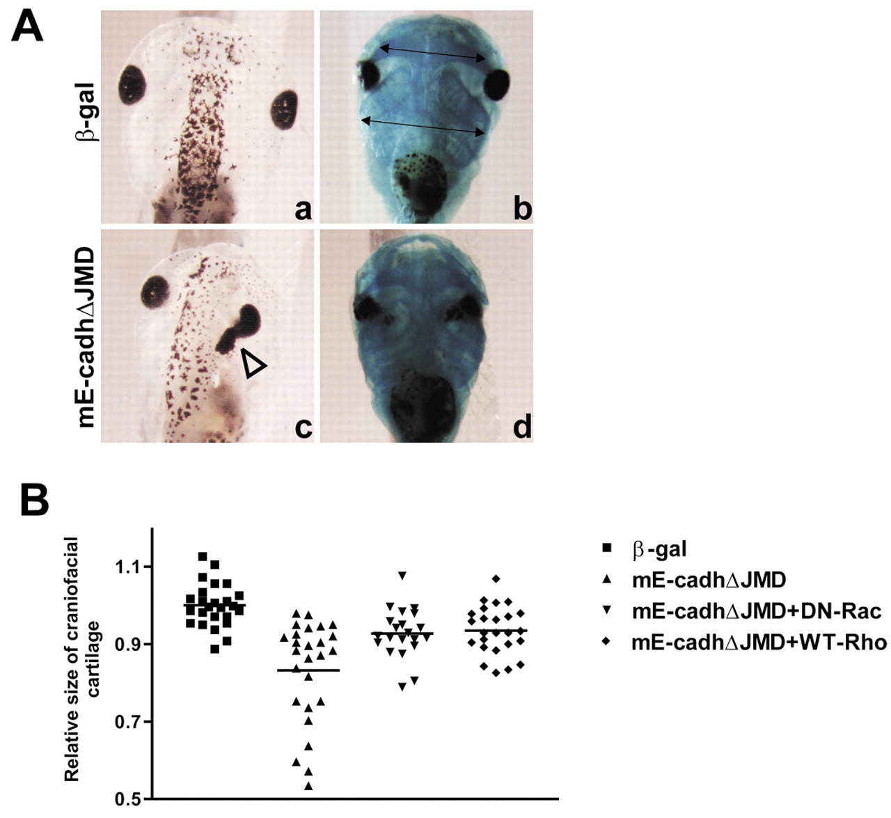Expression of JMD-deleted E-cadherin affects the eyes and cartilage. (A) Embryos were injected at the 8-cell stage in the dorsal-animal region and scored at stage 42 for the eye phenotype (a,c) and stage 46 for the cartilage phenotype after Alcian Blue staining (b,d). Embryos injected with 1 ng mE-cadhδJMD show malformation of the eye (c,d) compared with control injected embryos (a,b). The arrowhead in (b) indicates a patch of retinal pigmentation in the brain. (B) Graph representing the effect of mE-cadhδJMD on the size of the craniofacial cartilage. Three normalized experiments are represented in one graph. The width of the head was calculated as in the legend of Fig. 3. The effect of mE-cadhδJMD can be partially rescued by co-injection of 150 pg wild type (WT) RhoA or 50 pg dominant negative (DN) Rac (values are statistically different from those injected with mE-cadhδJMD RNA alone). |