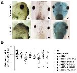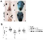 Expression of p120-uncoupled E-cadherin affects the size of the eyes and cartilage. (A) Embryos were injected at the 8-cell stage in the dorsal-animal region and scored at stage 42 for the eye phenotype (a,c) and stage 46 for the cartilage phenotype after Alcian Blue staining (b,d). Tadpoles injected with 2 ng XE-cadh753AAA showing one smaller eye (c,d) compared with control injected embryos (a,b). (B) Graph representing the effect of XE-cadh753AAA RNA on the size of the craniofacial cartilage. Three normalized experiments are represented in one graph. The size of the head was calculated as in the legend of Fig. 3. The effect of XE-cadh753AA can be partially rescued by co-injection of 150 pg wild type (WT) RhoA or 50 pg dominant negative (DN) Rac (values are statistically different from those injected with XE-cadh753AAA RNA alone). |