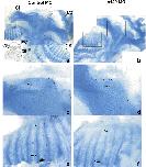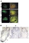 Abnormal evagination of the eye vesicles in embryos injected with p120 morpholino (MO) or RNA encoding JMD-deleted E-cadherin. (A) Embryos were injected at the 32-cell stage with Rhodamine-dextran and MO or RNA in two blastomeres in the region that contributes to the eye. At stage 16, knockdown of p120 leads to defects in the anterior loop structure of the closing neural tube (b, arrowheads). This can also be observed in a minority of embryos injected with mE-cadhδJMD (c, arrowhead) but not in embryos injected with control MO (a). At stage 21 the evagination of the eye has clearly started in control MO-injected embryos (d, see arrowheads). In embryos injected with p120 MO (e) and mE-cadhδJMD RNA (f) this process is disturbed. At this stage the anterior neuropore of p120 MO-injected embryos is still open (arrow in e). At early and late tailbud stages (stages 23 and 27) the control MO-injected embryos show a nicely formed eye (g,j, see arrowheads) compared with the p120 MO-injected embryos (h,k, see arrowheads). Expression of mE-cadhδJMD also leads to a disturbance of the eyes at early and late tailbud stages (i and l, see arrowheads). At stage 39, control MO-injected embryos show nicely formed eyes (m), compared with p120 MO-injected embryos, which exhibit smaller eyes (n), or mE-cadhδJMD injected embryos, which have malformed eyes (o). (B) Transverse sections of Rhodamine-injected and DAPI stained embryos at stage 21 and 39. At stage 21, the embryos injected with control MO show a good evagination of the eye vesicles from the neural tube (a,b, see arrowheads). This morphogenetic process is clearly aberrant in embryos injected with p120 MO (e,f) or mE-cadhδJMD (i,j) (see text for details). A schematic indicating the site of the section is shown in (m). At stage 39 embryos injected with control MO have eyes with a proper stratification of the retinal layers (c,d). The brain or neural tube (NT), the notochord (N) and the eyes (EY) are indicated. Eyes are smaller and the retinal stratification is lost in embryos injected with p120 MO (g,h, see arrowhead). Embryos expressing mE-cadhδJMD show stratification of the retina, but the eyes are malformed and are not well separated from the brain (k,l, see arrowhead). A schematic indicating the site of the section is shown in (n). |