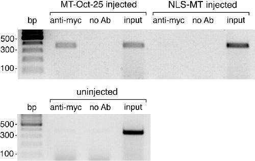 Oct-25 is bound to the Xvent-2B promoter in vivo. myc-tagged Oct-25 (MT-Oct-25) RNA or RNA encoding the myc tag fused to a nuclear localization signal (NLS-MT) was injected into all blastomeres of 4-cell stage embryos. Embryos were collected for ChIP assay when control sibling embryos had reached stage 19. The presence of the Xvent-2B promoter was detected by PCR from the DNA samples after anti-myc antibody precipitation (anti-myc) and without antibody precipitation (no Ab) and from the cross-linked chromatin supernatant before immunoprecipitation (input), respectively. Another ChIP control was performed in parallel under identical conditions with uninjected embryos.