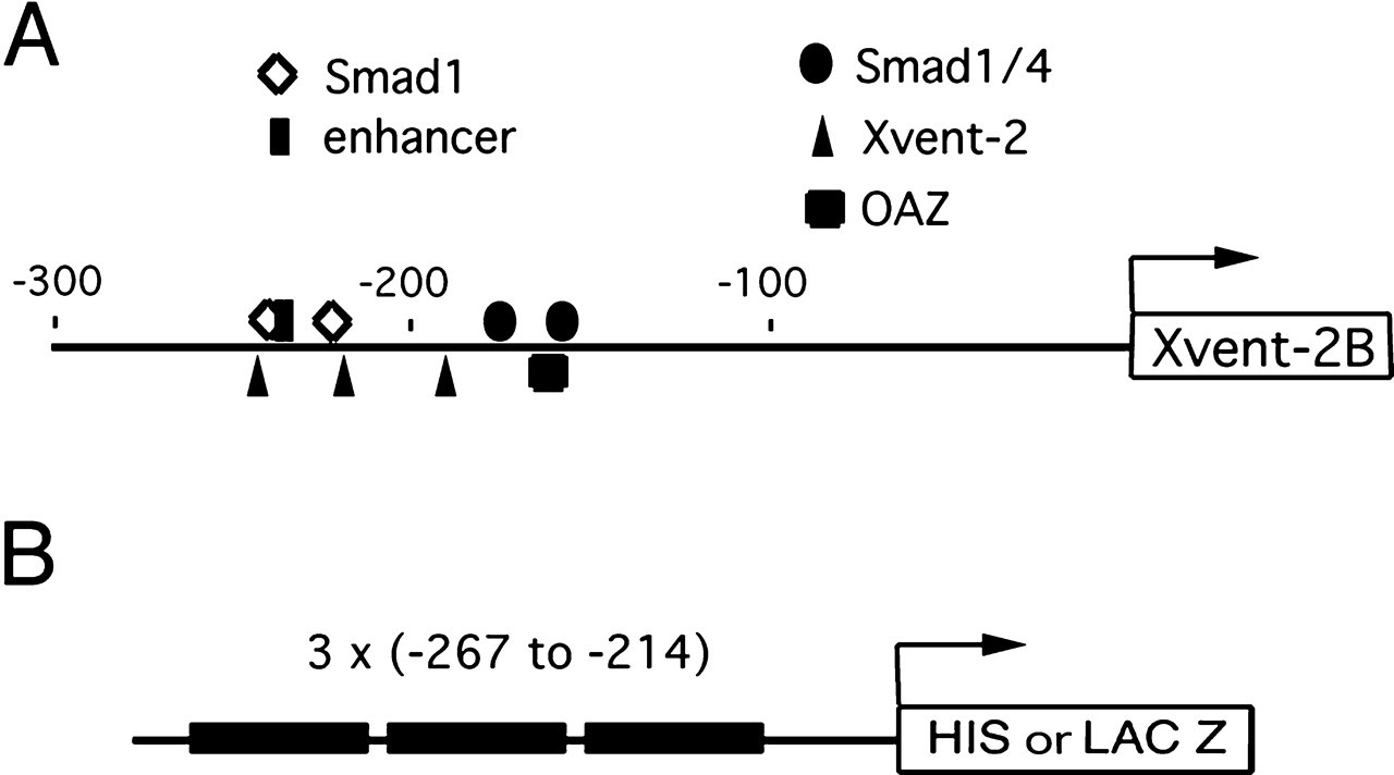 Xvent-2B promoter. A, proteins that bind to the 5′-flanking sequence and regulate Xvent-2B transcription (for details, see text). B, schematic drawing of yeast reporter constructs used for the one-hybrid screen. Three copies of the -267 to -214 region of the Xvent-2B gene were cloned in front of the His or LacZ gene, respectively.