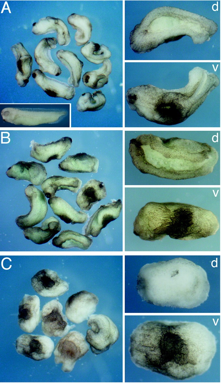 Overexpression of Oct-25. Oct-25 RNA was injected into all four blastomeres of 4-cell stage embryos at a total amount of 150 pg (A), 300 pg (B), or 1 ng (C). Dorsal (d) and ventral (v) views of injected embryos are shown. The inset in A shows an uninjected control embryo.