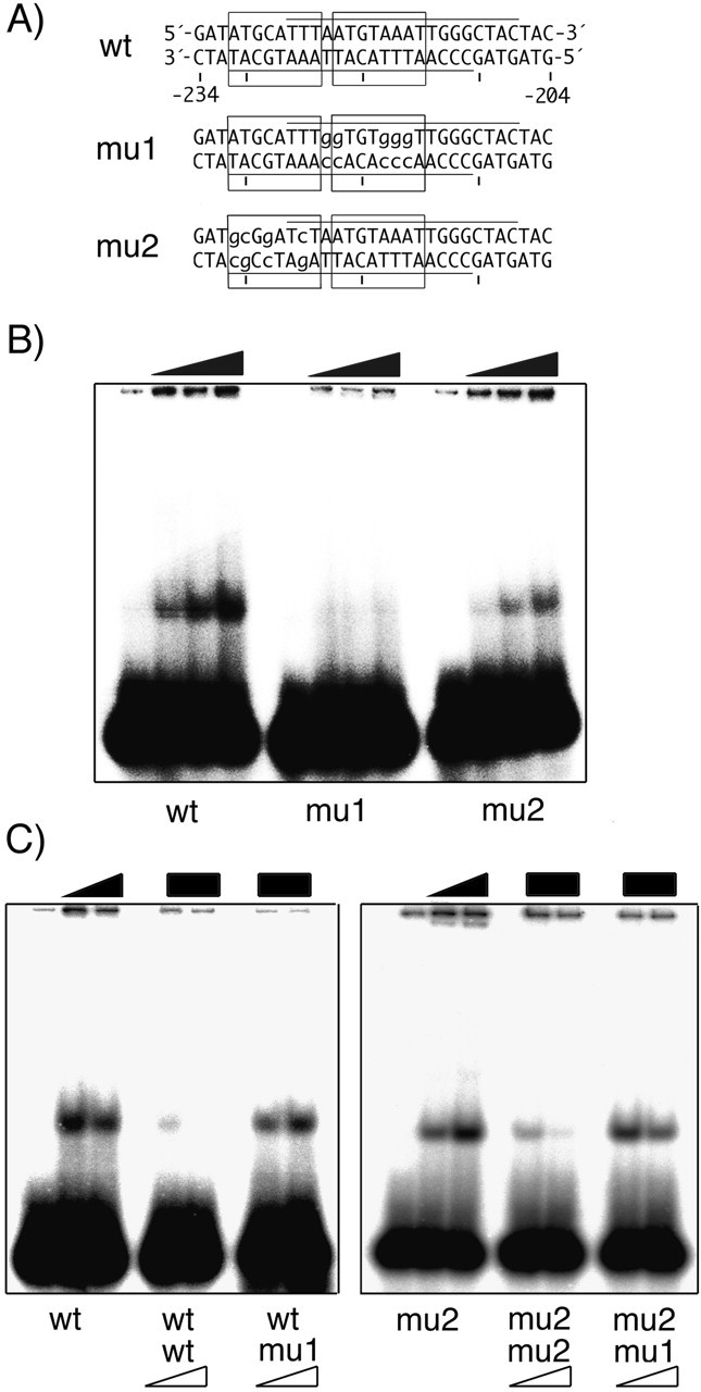 Mutational analysis of the Oct-25 binding site. A, the oligonucleotides containing the wild type or mutated -234 to -204 region of the Xvent-2B gene were 32P end-labeled and annealed. wt is the wild type sequence, and mu1 and mu2 are mutated at the indicated positions (nucleotides in lowercase letters). B, samples were incubated with increasing concentrations of the POU/homeodomain of Oct-25 protein (filled triangle) and submitted to EMSA. Note the failure of mu1 to bind the protein. C, binding of the POU/homeodomain of Oct-25 with wt or mu2 was competed for by increasing concentrations of unlabeled wt, mu1, or mu2 targets (open triangles). Note that binding of labeled wt or mu2 is efficiently reduced by unlabeled wt and mu2 but not by mu1.