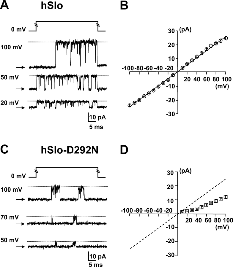 Figure 2. . Single channel conductance reduction by the D292N mutation. Single channel currents were recorded from excised inside-out patches of Xenopus oocytes injected with hSlo (A) and hSlo-D292N (C). 40-ms voltage pulses to various potentials (numbers at left) were applied from 0-mV holding potential. The closed state indicated with arrows and the open channel current level is indicated with a dotted line. The recordings are done in symmetrical 120 mM K+ solutions with contaminant Ca2+. (B and D) Single channel I–V curves (hSlo, n = 5, and hSlo-D292N, n = 7). The outward conductance of the hSlo-D292N channel is approximately half of the conductance of the hSlo channel.