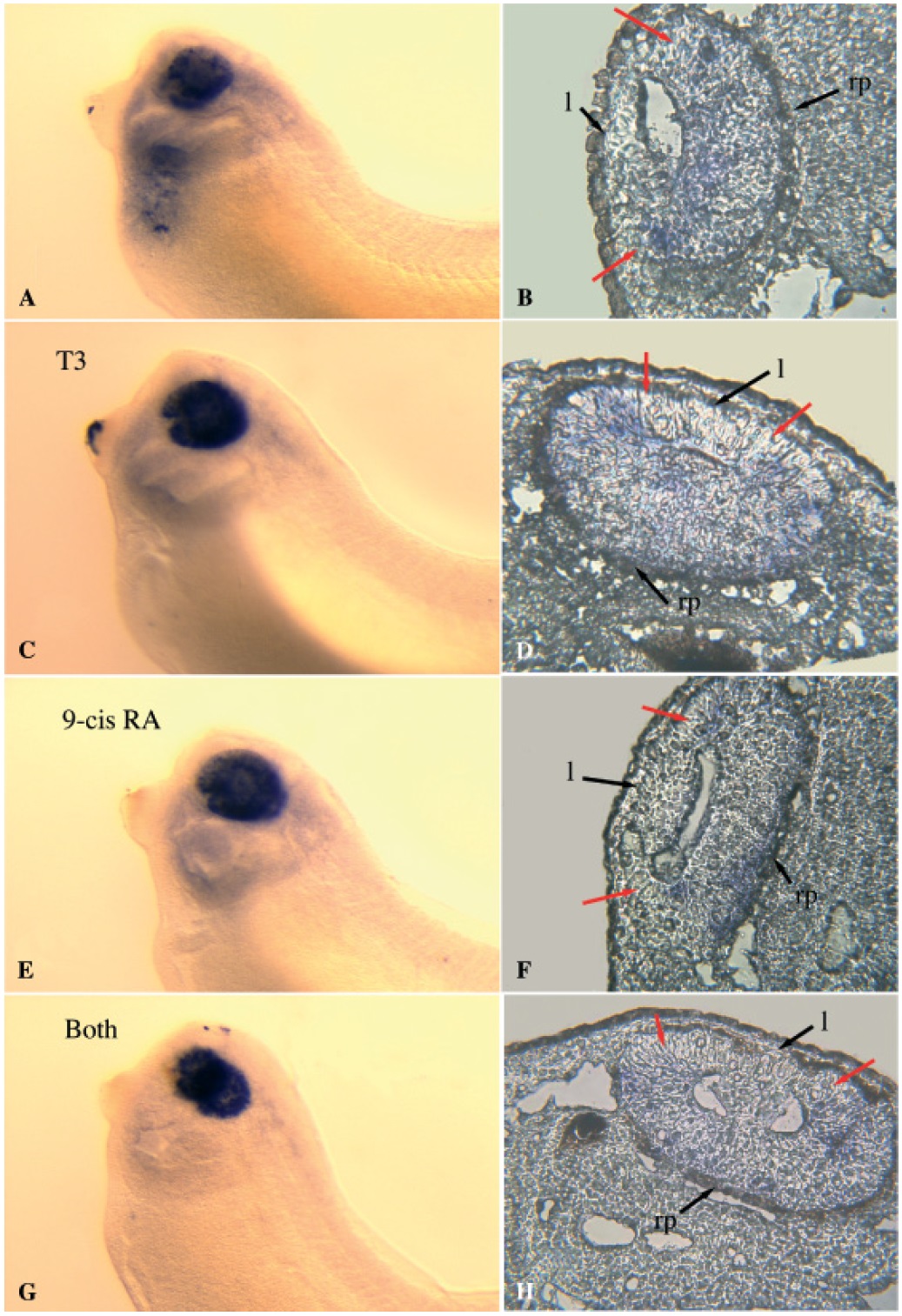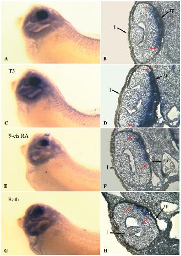 embryos treated with T3 (C, D), 9-cis RA