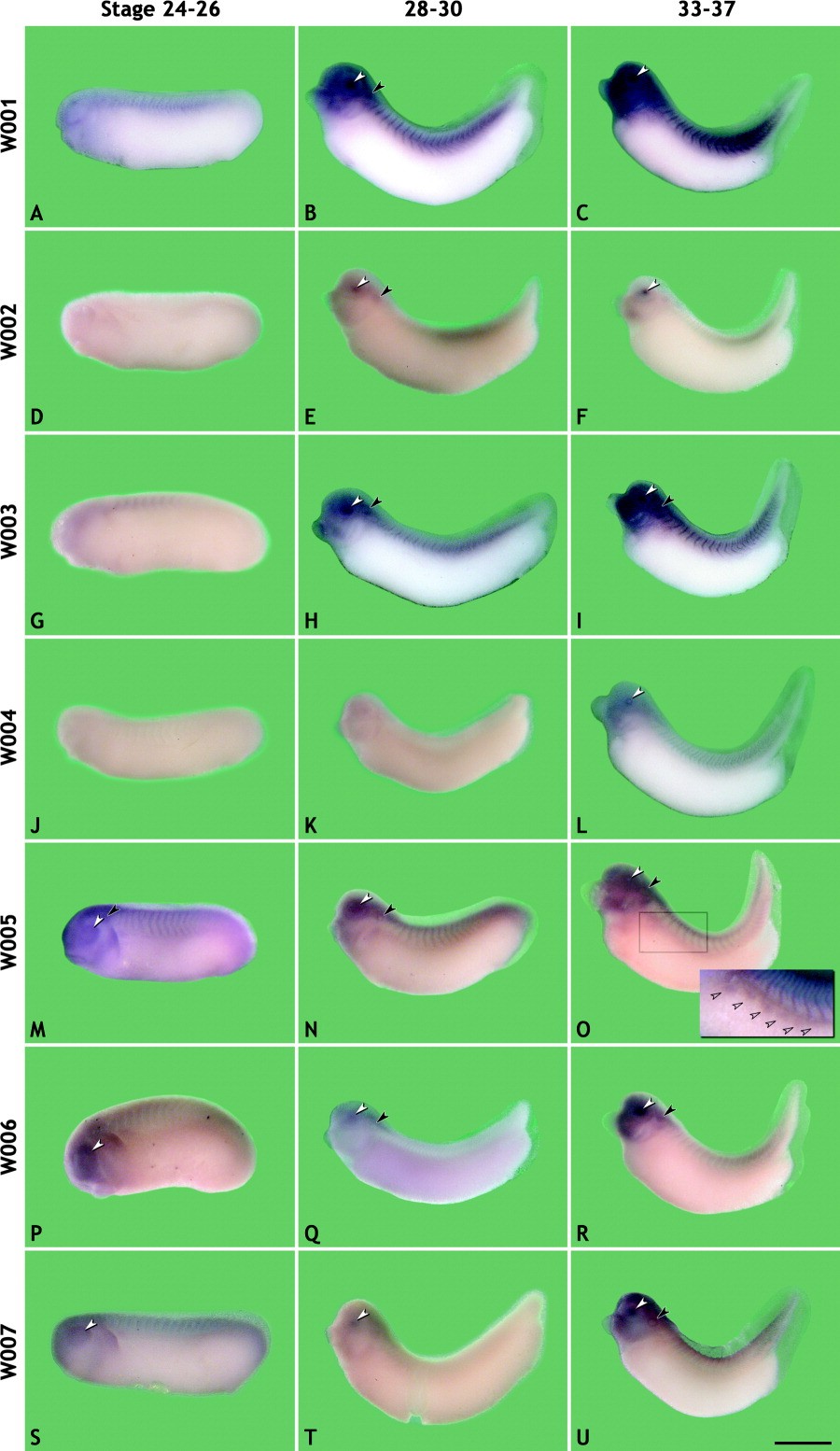 Figure 1. Spatiotemporal expression of clones W001 through W007 during selected posthatching stages. Embryos and early larvae at the stages indicated in the top row were probed with ldquo antisense rdquo riboprobes against the clones indicated in the leftmost column. All specimens are shown with the anterior end to the left and the dorsal surface toward the top of the figure. Where indicated, white arrowheads indicate the position of the presumptive lensectoderm or lens and black arrowheads indicate the position of the otic vesicle. The inset in O (W005) is a twofold enlargement of the boxed area in another specimen that underwent longer color development after in situ hybridization to reveal mRNA localization in discrete groups of migrating somite-derived cells (open arrowheads) described by Martin and Harland ([2001]), which presumably represent hypaxial myoblasts. Scale bar = 1 mm in U (applies to A-U), 0.5 mm in O inset.