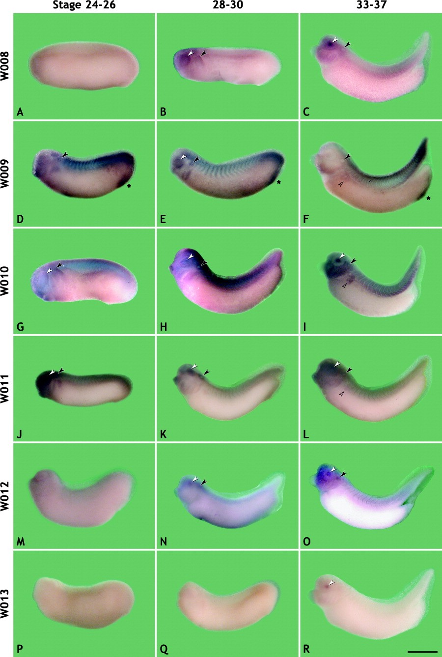Figure 2. Spatiotemporal expression of clones W008 through W013 during selected posthatching stages. Embryos and early larvae at the stages indicated in the top row were probed with ldquo antisense rdquo riboprobes against the clones indicated in the leftmost column. All specimens are shown with the anterior end to the left and the dorsal surface toward the top of the figure. Where indicated, white arrowheads indicate the position of the presumptive lensectoderm or lens and black arrowheads indicate the position of the otic vesicle. Open arrowheads indicate the position of the pronephros in F, I, and L. Prominent staining of the cloacal region by W009 is evident adjacent to asterisks in D-F. Scale bar = 1 mm in R (applies to A-R).