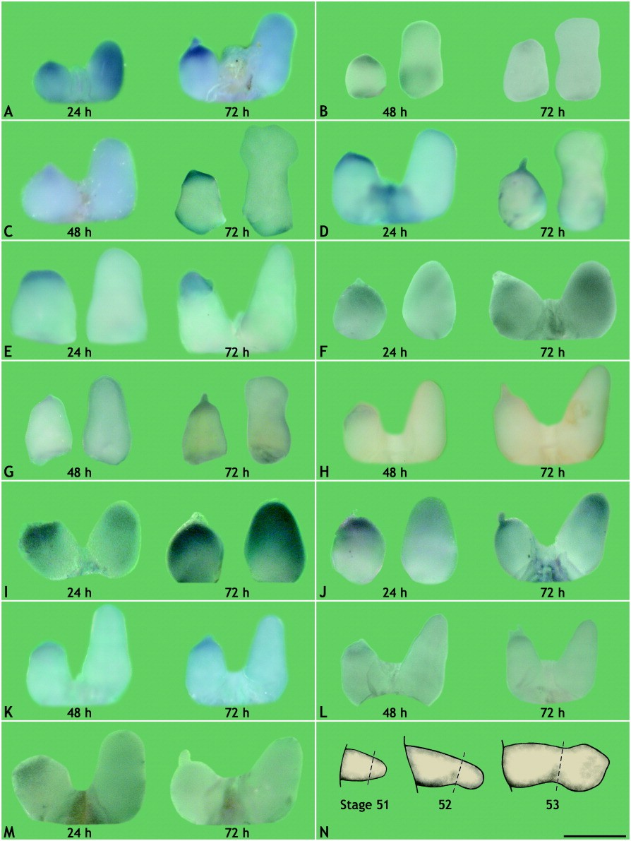 Figure 3. Expression during hindlimb regeneration. Each clone's expression during hindlimb regeneration was examined using in situ hybridization 24, 48, and 72 hr after amputation through the left presumptive ankle joint at stages 51-53. The rightlimb in each case was also examined for expression in the unoperated, developing hindlimb. The paired limbs are shown with the distal (or amputated) end toward the top of the figure. Each sample may be staged by the morphology of the control limb on the right; differences in regeneration blastema expression were not observed among the three stages chosen for amputation. Clones used as riboprobe are shown as follows: A, W001; B, W002; C, W003; D, W004; E, W005; F, W006; G, W007; H, W008; I, W009; J, W010; K, W011; L, W012; M, W013. Each panel displays a representative limb pair from either a 24 hr or 48 hr regenerate ( ldquo early rdquo time point) and a limb pair from a 72 hr regenerate ( ldquo later rdquo time point). In some, but not all, cases background staining was observed at the base of a limb, corresponding to the site where the limbs were detached from the flank tissue after fixation (e.g., B, leftlimb pair); this staining was also observed in ldquo sense rdquo probe controls (not shown) and is an artifact relating to tissue preparation. N: Illustrations of limb morphology used to stage each set of limbs are shown; the dashed lines indicate amputation sites at each stage (illustrations modeled after Nieuwkoop and Faber, [1956]). The stage at which each sample was amputated may be ascertained by comparison with these staging diagrams (recovery times were not sufficient for specimens to advance in developmental stage). Scale bar = 1 mm in N (applies to A-N).