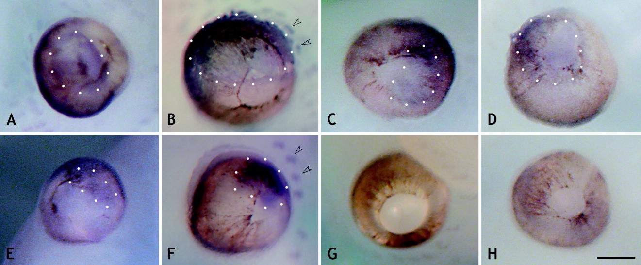 Figure 4. Expression of selected clones during cornea-lens transdifferentiation. mRNA expression was examined by means of in situ hybridization 24, 48, 72, and 96 hr after lentectomy in tadpoles at stages 47-51. Representative examples and regeneration times are shown as follows: A, W001 at 48 hr; B, W002 at 24 hr; C, W003 at 24 hr; D, W004 at 24 hr; E, W007 at 24 hr; F, W011 at 96 hr. White dotted lines illustrate the approximate boundary of staining in the corneaepithelium. Open arrowheads in B and F indicate prominent staining of lateral line organs by probes W002 and W011, respectively. G: The contralateral, unoperated lens from F (probed with W011). H: An eye 96 hr after lentectomy probed with a ldquo sense rdquo control riboprobe for W011. All specimens were examined during developmental stages 47-51 (Nieuwkoop and Faber, [1956]); eye morphology does not demonstrably differ during these stages. Scale bar = 300 mu m in H (applies to A-H).