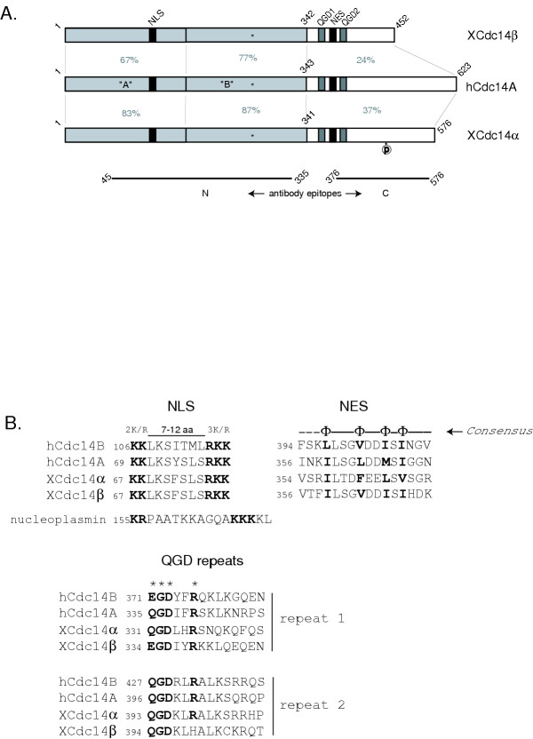 Figure 1. Primary Structure of Xenopus Cdc14α and Cdc14β phosphatases A. Schematic comparison of XCdc14α, XCdc14β and hCdc14A. The gray regions in hCdc14A correspond to the dual specificity phosphatase (DSP) domains identified in the crystal structure of hCdc14B. The nuclear export signal (NES), putative nuclear localization signal (NLS), and QGD repeats present in hCdc14A are conserved in XCdc14α and XCdc14β and are represented by shaded boxes. The asterisks represent the active site cysteines, and the circled p represents a canonical Cdk phosphorylation site (SPLK) located at residues 443–446 of XCdc14α. The solid lines at the bottom of the figure represent the regions of XCdc14α that were used for immunizations. Percentage identities between the subregions are indicated in grey. B. Alignment of the NLS, NES, and QGD sequences of hCdc14B, hCdc14A, XCdc14α and XCdc14β. Top left: hCdc14A, hCdc14B, XCdc14α, and XCdc14β contain putative bipartite NLS sequences that conform to the consensus motif (R/K)2X7–12(R/K)3,. The sequences are aligned with the bipartite NLS from nucleoplasmin. Top right: Alignment of the NES sequences that are present in all four Cdc14 homologs. The NES of hCdc14A was shown to be functional by mutational analysis [21]. The φ in the consensus motif signifies hydrophobic amino acids. Bottom: Alignment of conserved C-terminal QGD motifs.