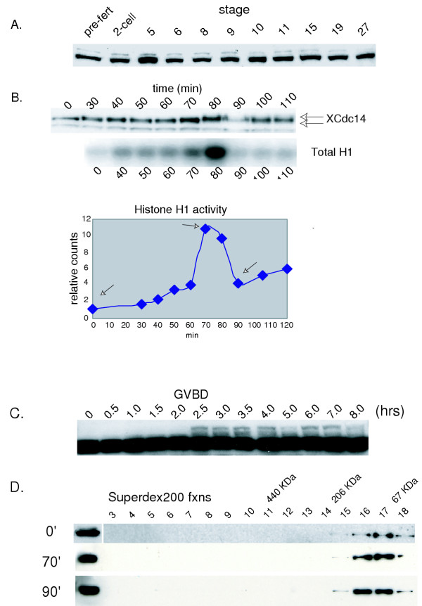 Figure 3. XCdc14α is mitotically phosphorylated during oocyte maturation and in the Xenopus embryonic cell cycle. A. XCdc14α protein levels are constant during development. Xenopus eggs were fertilized in vitro and at the indicated stages were frozen down for subsequent immunoblot analysis. B. XCdc14α is phosphorylated in mitosis in cycling Xenopus extracts. At the indicated times, samples from cycling extracts were frozen in liquid nitrogen for subsequent immunoblot analysis with anti-XCdc14α antibodies (top panel) and total histone H1 kinase activity (lower panel). For the immunoblot, lysates were resolved on 11% SDS PAGE gels. C. XCdc14α becomes phosphorylated after germinal vesicle breakdown (GVBD) in the maturing oocyte. Defolliculated Stage VI oocytes were induced to mature by the addition of progesterone (10 μg/ml). At the indicated times, oocytes were flash frozen for subsequent immunoblot analysis with antibodies against XCdc14α. GVBD occurred between 2 and 2.5 hrs. D. The majority of XCdc14α is monomeric or dimeric through the cell cycle. At 0, 70 and 90 min, samples from cycling extract were flash frozen in liquid nitrogen. Left: samples from the cycling extract were tested for total histone H1 kinase activity. Arrows indicate timepoints that were analyzed. Right: The frozen samples were diluted 10-fold in XB buffer, and 50 μg (1 μl equivalent of undiluted lysate) was fractionated on a Superdex200 gel filtration and probed with anti-XCdc14α antibodies. The elution profiles of molecular weight standards are depicted above the fractions.