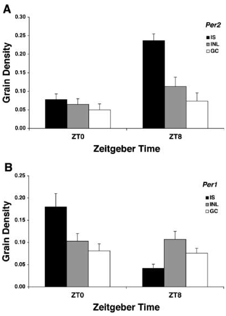 (A) and xPer1 (B) mRNA in retinas fixed at ZT0 and at ZT8 (X-axis). The Yaxis