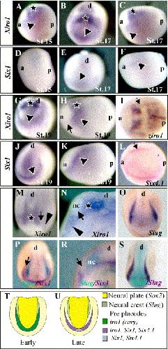 Fig. 1. The iro genes are expressed in the placodal field of Xenopus and zebrafish embryos. In situ hybridization of iro1, preplacodal, placodal, and neural crest markers was performed at different stages of Xenopus (A-H, J, K, M-S) and zebrafish embryos (I, L). a: anterior; p: posterior; d: dorsal; star: neural plate expression of iro1; arrowhead: preplacodal expression of iro1. (A) Xiro1 expression in a stage 15 embryo. Lateral view. (B, C) Xiro1 expression in a stage 17 embryo, in an anterior (B) and lateral (C) view. (D) Six1 in situ hybridization of a stage 15 embryo. Lateral view. (E, F) Six1 expression in a stage 17 embryo, in an anterior (E) and lateral (F) view. (G, H) Xiro1 expression in a stage 19 embryo, in an anterior (G) and lateral (H) view. (I) ziro1 expression in a tail bud stage zebrafish embryo (10.5 h postfertilization, hpf). Dorsal view, arrow indicates the preplacodal domain of expression. (J, K) Xiro1 expression in a stage 19 embryo, in an anterior (J) and lateral (K) view. (L) Six4.1 expression in a tail bud stage zebrafish embryo (10.5 h postfertilization, hpf). Dorsal view, arrow indicates the preplacodal domain of expression. (M) Xiro1 expression in a stage 21 embryo, dorsal view, posterior to the top. Arrow indicates the gap of expression between the neural (star) and placodal (arrowhead) expression of Xiro1. (N) section of embryo shown in M. (O) Slug expression in a stage 20 embryo. Dorsoanterior view. (P) Double in situ hybridization of a stage 20 embryo for Six1 (purple) and Slug (green). Anterior view. (R) Section of embryo shown in P. Note the gap in the expression of both genes indicated by the arrowhead. (S) Double in situ hybridization of a stage 20 embryo for Slug (purple) and Sox2 (green). Anterior view. (T, U) Summary of neural plate, neural crest, and preplacodal markers, for early (T) and late (U) neurula stages. |