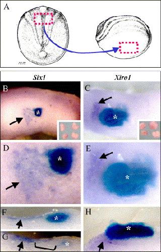 Fig. 3. The preplacodal markers Six1 and Xiro1 are induced by an interaction between neural plate and epidermis. (A) A piece of anterior neural plate was dissected from a stage 13 embryo, previously labeled with FLDx at the one-cell stage, and grafted into the ventral epidermis of a normal stage 13 embryo. The grafted embryo was cultured until stage 25, when the expression of the preplacodal markers Six1 (B, D, F, G) or Xiro1 (C, E, H) was analyzed. Inset: control neural plate cultured in isolation, where no expression is seen. Arrow: induction of the marker; star: graft. Anterior to the left. (B) Induction of Six1 in the epidermis adjacent to the graft. (C) Induction of Xiro1 in the epidermis adjacent to the graft. (D) Higher magnification of the graft shown in B. (E) Higher magnification of the graft shown in C. (F–H) Section of different grafts, showing that the induced cells (arrow) are sometimes not adjacent to the graft (bracket in G). Forty-eight percent of the grafts showed Six1 induction, n = 29; 45% of the grafts showed Xiro1 induction, n = 28. |
