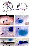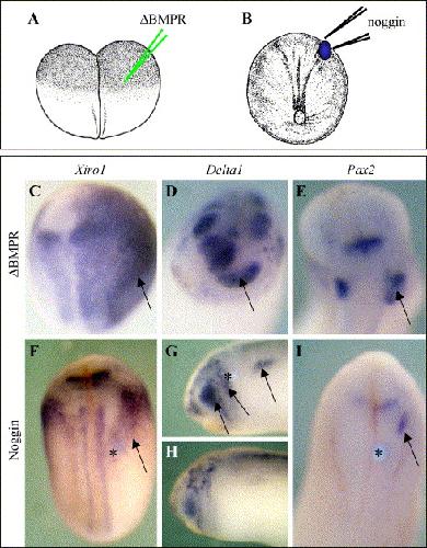 Fig. 6. Specification of the preplacodal field and placodes by BMP in Xenopus embryos. The level of BMP activity was changed by injection of the mRNA that codes for the dominant negative of the BMP receptor (ΔBMPR) in Xenopus (A, C–E) or by implanting beads soaked with noggin in early neurula Xenopus embryos (B, F–I). The expression of the preplacodal (Xiro1) and specific placodal markers (Delta1, Pax2) was analyzed under these conditions. (C–E) An expansion in the preplacodal marker Xiro1 (C) or the placodal markers Delta1 (D) and Pax2 (E) was observed when 125 pg of ΔBMPR mRNA were injected in one blastomere of a two-cell stage embryo. Arrows: expansion of the markers in the injected side. (F–I) Implantation of noggin soaked beads (asterisks) leads to an expansion of the preplacodal marker Xiro1 (F) and the placodal markers Delta1 (G, grafted side; H, control side) and Pax2 (I). Arrow indicates the expansion of the markers in the experimental side. |