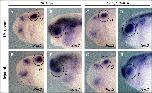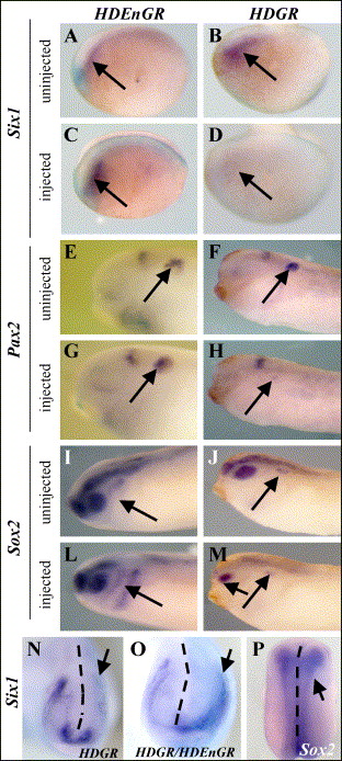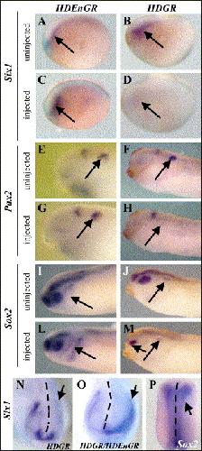Fig. 7. Xiro1 is required for preplacodal and placodal development. Two-cell stage embryos were injected in one blastomere with 1 ng of the inducible forms of a repressor form of Xiro1 (HDEnGR) (A, C, E, G, I, L), or with a dominant negative form of Xiro1 (HDGR) (B, D, F, H, J, M). The embryos were treated with dexomethasone at stage 12 and the expression of Six1, Pax2, and Sox2 was analyzed by in situ hybridization. The injected side was visualized by alkaline phosphatase-mediated FITC inmunostaining. The uninjected (A, B, E, F, I, J) and injected (C, D, G, H, L, M) side of the same embryos are shown. (A, C, E, G, I, L). The injection of HDEnGR leads to a moderate enlargement of Six1 expression (A, C, arrow) and to a moderate expansion of the otic placodal marker Pax2 (E, G; arrow) and the epibranchial placode marker Sox2 (I, L; arrow). (B, D, F, H, J, M) The injection of HDGR leads to a complete inhibition of the preplacodal marker Six1 (B, D, arrow) and to an inhibition of the otic placodal marker Pax2 (F, H; arrow) and the lens and epibranchial placode marker Sox2 (J, M; arrows). (N, O) Rescue experiment. Embryos were injected with HDGR as described, showing the characteristic inhibition of Six1 in the injected side (arrow); however, this effect was rescued by coinjection of HDGR and HDEnGR, as is seen in the injected side (arrow). (P) Sox2 expression in stage 16 embryo injected with HDGR. No effect in the neural plate can be detected. Each experiment was performed at least twice with a minimum of 42 embryos. The percentage effect for each experiment was approximately 65%. For the rescue experiment, the percentage of effect was less than 10%. |