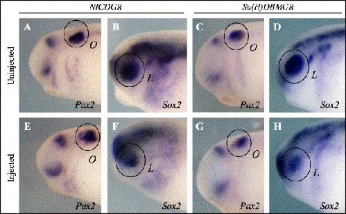 Fig. 8. Notch signaling on placode development. Two-cell stage embryos were injected in one blastomere with 0.7 ng of NICDGR (A, B, E, F) or 0.25 ng of Su(H)DBMGR (C, D, G, H). Injected embryos were cultured from stage 12 in medium containing dexamethasone and the expression Pax2 (A, E, C, G) and Sox2 (B, F, D, H) was analyzed by in situ hybridization. The injected side was recognized by alkaline phosphatase-mediated FITC immunostaining. The uninjected (A–D) and injected (E–H) sides of the same embryos are shown. The expression of markers in several placodes is indicated. O. otic; L: lens. (A, C, E, G). The injection of NICDGR does not produce any obvious effect in the expression of the otic placodal marker Pax2 (A, E) or the epibranchial placode marker Sox2 (B, F). The injection of Su(H)DBMGR does not have any effect on the expression of the otic placodal marker Pax2 (C, G) and the epibranchial placode marker Sox2 (D, H). Each experiment was done at least twice with a minimum of 45 embryos. |