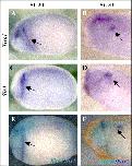Fig. 2. Expression of MXiro1 at later stages. Anterior to the left, dorsal to the top: arrow, indicates placodal expression. (A, B) Xiro1 expression at stage 20 (A) and 33 (B). (C, D) Six1 expression at stage 20 (C) and 33 (D). (E) Double in situ hybridization for Xiro1 (green) and Six1 (purple) at stage 20. (F) Double in situ hybridization for Xiro1 (green) and Pax2 (purple) at stage 33. Arrow in F indicates the otic placode. |