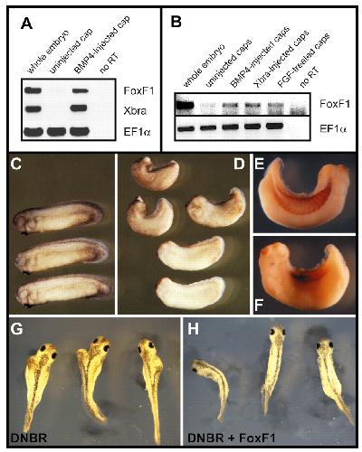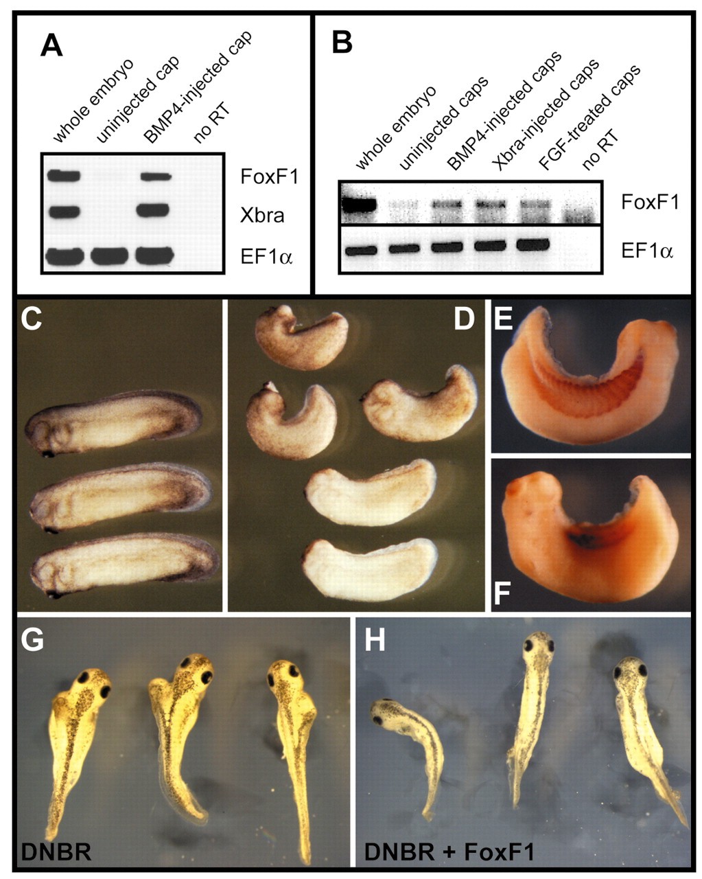 Fig. 6. FoxF1 is a target and a mediator of BMP4 signaling. (A) RT-PCR analysis of RNA isolated from animal caps injected with BMP4 RNA. Animal caps from embryos injected with BMP4 RNA (1.5 ng) into the animal blastomeres or uninjected embryos were dissected at stage 8 and collected when siblings reached stage 12.5. Xbra was used as a positive control for BMP4 induction and EF1α as a loading control. Lane 1 - RT-PCR on RNA from a whole embryo. Lane 2 - uninjected cap. Lane 3 - BMP4 injected cap. Lane 4 - no RT (no enzyme, RNA from the whole embryo). (B) RT-PCR analysis of RNA isolated from animal caps injected with BMP4 or Xbra RNA, or treated with FGF protein. Animal caps from embryos injected with BMP4 (1.5 ng) or Xbra (2.5 ng) RNA into the animal blastomeres or uninjected embryos were dissected at stage 8. Caps were collected when siblings reached stage 12.5 and assayed by RT-PCR. For FGF experiments, a set of uninjected caps was dissected at stage 8 and treated with 200 ng/ml bFGF for 1 hour. (C-F) Effects of FoxF1 RNA injection on the morphology of Xenopus embryos. Two dorsal blastomeres at the 4-cell stage were injected with FoxF1 RNA (0.4-1 ng), and phenotypes were analyzed at stage 28-30. The injected embryos (D) show different degrees of ventralization, while their siblings (C) display normal morphology. (E,F) The right (E) and left (F) side of a stage-30 embryo injected in the left side with FoxF1 RNA immunostained with 12/101 antibodies that recognize somatic mesoderm. The left side of the embryo shows a significant reduction of this marker. (G,H) FoxF1 RNA can rescue axis duplication caused by the injection of dominant-negative BMP receptor (DNBR). (G) Embryos injected with DNBR RNA (1.5 ng) showing axis duplications. (H) Embryos injected with DNBR and FoxF1 RNA (1.5 ng, 1.25 ng) demonstrate that FoxF1 RNA can rescue the DNBR phenotype.