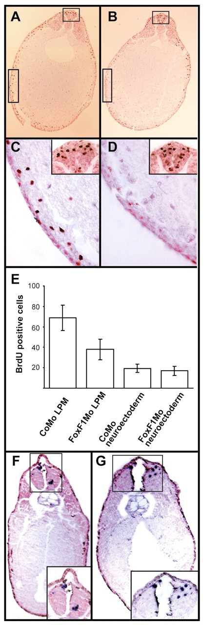 Fig. 5. A lower rate of lateral plate mesoderm proliferation in FoxF1 knockdown embryos. (A-D) Cell proliferation as visualized by BrdU incorporation (brown nuclear staining). Transverse sections through the midtrunk of stage-20 embryos injected with CoMo (A) or FoxF1Mo (B) show drastically reduced cell proliferation in the lateral plate mesoderm of FoxF1 knockdown embryos. The boxed areas are magnified in (C,D). (C) Higher magnification of the boxed areas in (A), showing BrdU-positive cells in the lateral plate mesoderm and in the neuroectoderm (inset) of a CoMo-injected embryo. (D) Higher magnification of the boxed areas in (B), showing a lack of BrdU-positive cells in the lateral plate mesoderm but a normal number of BrdU-positive cells in the neuroectoderm (inset) of a FoxF1Mo-injected embryo. (E) A column chart showing the numbers of BrdU-positive nuclei in the lateral plate mesoderm and neuroectoderm of CoMo- and FoxF1Mo-injected embryos at midtrunk level (averages±s.e.m.). Nuclei were counted on 10 sections derived from 5 control embryos and 20 sections from 11 FoxF1 knockdown embryos in two independent experiments. The difference in proliferation rate between control and knockdown lateral plate mesoderm is statistically significant (P=5.9 à 10-6 in a two-tailed t-test). LPM: lateral plate mesoderm. (F,G) TUNEL assay on stage-28 embryos injected with CoMo (F) and FoxF1Mo (G). Apoptotic cells (blue staining, inset) are mostly located in the neuroectoderm. No significant differences were observed between embryos injected with CoMo and FoxF1Mo.