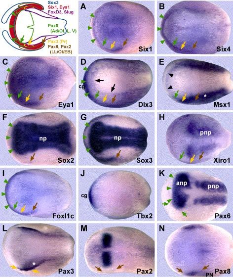 Genes referenced: bcl2l11 dlx3 eya1 foxd3 foxi3 frzb2 irx1 msx1 neurog2 nppa pax2 pax3 pax6 pax8 pnp six1 six4 snai2 sox2 sox3 tbx2 tbx3