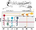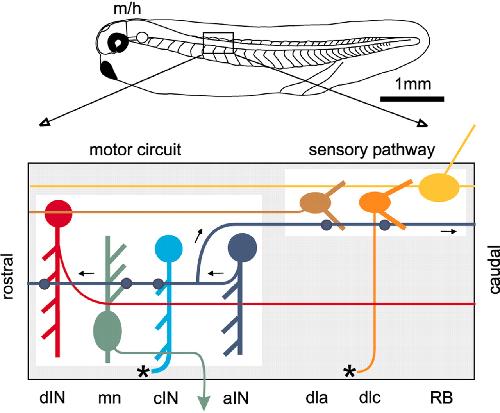 Figure 1. The tadpole and its spinal neurons. The Xenopus tadpole at the time of hatching (stage 37/38), with its head to the left, showing the eye, the border between midbrain and hindbrain (m/h), and the spinal cord lying under segmented swimming muscles. Below is a diagram of a length of spinal cord viewed from the side to show the neurons. Glycinergic aINs (purple) have ascending and descending axons that could contact and inhibit: dorsolateral commissural INs (dlc) and dorsolateral ascending INs (dla). These are excitatory sensory pathway interneurons, excited by skin sensory, touch-sensitive Rohon-Beard neurons (RB) that have no dendrites. aINs could also inhibit neurons that are active during swimming: mns, excitatory dINs, glycinergic reciprocal inhibitory cINs, and other aINs (data not shown). For each neuron class, the circle/oval is the soma; oblique lines indicate the dorsoventral extent of the dendrites; and the thin line shows the axon projection (asterisk indicates that the axon crosses ventrally to the opposite side). Each class of neuron actually forms a longitudinal column of 50-150 neurons on each side of the cord. |