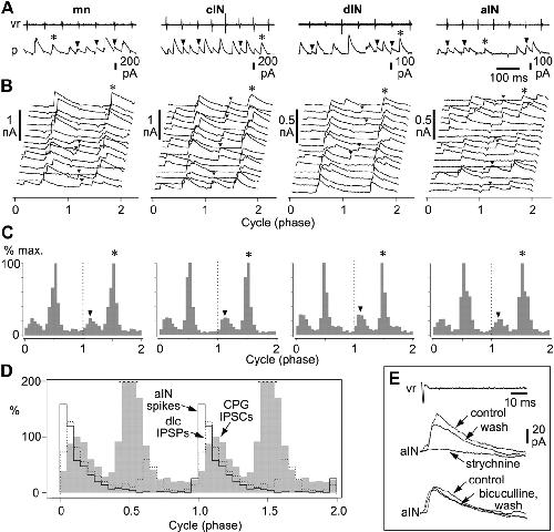 Figure 4. Pattern of early-cycle IPSCs during swimming. A, Voltage-clamp records made with a patch electrode (p) at positive holding potentials show IPSCs during swimming in a mn, cIN, dIN, and aIN. Swimming activity recorded from a ventral root (vr). Here, and in B and C, some early-cycle IPSCs are indicated by arrowheads and mid-cycle IPSCs by an asterisk. B, Waterfall plots showing the timing of IPSCs during swimming for the same recordings as in A. Each line shows a consecutive pair of cycles, normalized individually to a cycle phase of 1.0. Cycles are defined by the start of consecutive ventral root bursts and corrected for the longitudinal spacing between the neuron and vr recording position (which would otherwise add a timing error) (see Li et al., 2002). The second cycle on each line becomes the first cycle of the line below (n = â¼15 cycles per plot). C, Phase histograms to show the timing of IPSCs during swimming in CPG interneurons and motoneurons. Data for each cycle are plotted twice (cycle phase, 0-2), and the peak of early-cycle IPSCs is indicated (arrowhead). The numbers in each histogram bin were normalized to the mid-cycle peak value for each type of neuron (100%). In calculating correlations (see Results), the values between phase 0.35 and 0.7 were omitted to minimize the influence of mid-cycle IPSCs (asterisks), which are from cINs on the opposite side, not from aINs. D, The timing of early-cycle IPSCs during swimming (shaded bars are combined data from all plots in C) correlates well with the firing phase of aINs (solid line; total of 668 spikes in 16 aINs). The aIN spike data have been normalized to give the same total number of spikes as IPSCs between cycle phases 0 and 0.35. The dotted line shows the timing of IPSPs in sensory pathway dlc interneurons (data from Li et al., 2002). The peak in CPG IPSCs at phases of â¼0.5 (mid-cycle) goes off scale. E, Early-cycle IPSCs in swimming, measured under voltage clamp in an aIN, are blocked by 2 μM strychnine with partial reversal but are not affected by 20 μM bicuculline. The averages are of â¼15 cycles each. Traces are aligned to the onset of the cycle, indicated by the start of the ventral root burst (vr). |