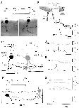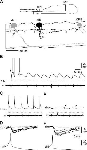 Figure 5. A single aIN inhibits both a CPG and a sensory pathway dlc interneuron. A, Tracings to show the anatomy of an aIN (black) and two interneurons that it contacts: an unidentified CPG interneuron (gray) with possible synaptic contacts (arrow) from the ascending axon (a) and a dlc interneuron with possible contacts (arrow) from the descending axon branch (d). The CPG neuron staining was weak, so its detailed features and axon could not be resolved. B, When swimming (see vr; recorded â¼5 segments more caudal) is initiated by a skin stimulus (at arrow), the aIN is depolarized from the resting potential (dotted line) and fires on two cycles. C, During swimming, the CPG interneuron is also depolarized but fires on each cycle of swimming. D, In the first paired recording from this aIN, injecting current to evoke action potentials leads to variable amplitude IPSPs and some failures (gray traces) in the CPG interneuron. E, During swimming, the sensory pathway dlc interneuron receives some early-cycle (arrowheads) and some mid-cycle IPSPs, made larger by injection of depolarizing current. F, When the same aIN is recorded again with this dlc interneuron, current-evoked action potentials leads to variable amplitude IPSPs. |