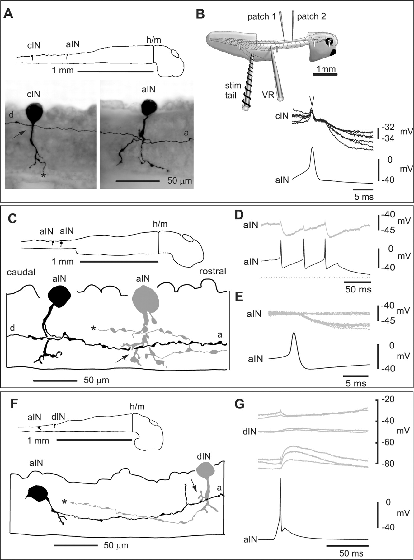 Figure 2. Diagram of the tadpole preparation and paired whole-cell recordings to show that aINs produce direct inhibition of spinal CPG neurons. A, Scale diagram of the CNS viewed from the right showing the location of two neurobiotin-filled neurons with a synaptic connection, shown in more detail in the micrographs below. Each neuron has a spherical soma and a ventral process with dendrites. The aIN has an ascending axon (a) and a descending axon (d) with possible synaptic contact onto a cIN dendrite (see arrow). The ventral cIN axon goes out of focus (asterisk). B, inset, the dissected tadpole with its spinal cord exposed is held with four micropins. Patch electrodes record two spinal neurons. Swimming can be initiated by a current pulse to excite sensory innervation of the tail skin (stim tail) and recorded from a ventral root (VR). Current-clamp recordings show impulses evoked by current injection into the aIN in A lead to constant latency, variable amplitude IPSPs in the cIN that was deploarized to increase IPSP amplitude (7 traces overlapped). The aIN impulse causes a cross-talk artifact in the cIN (arrowhead). C, Tracings to show the anatomy of two neurobiotin-filled aINs with a possible synaptic contact (arrow) from the axon of the presynaptic aIN (black) onto the postsynaptic aIN (gray), the descending axon of which is not shown beyond the asterisk. D, Three current-evoked impulses in the caudal aIN in C (dots mark its resting potential) lead to short latency IPSPs in the other aIN. The postsynaptic aIN was deploarized to increase IPSP amplitude. E, The same neurons as in C, where superimposed records show small constant latency IPSPs, with some failures, in the rostral aIN after impulses in the caudal aIN. F, Tracings to show the anatomy of an aIN (black) and a dIN (gray) with possible synaptic contact (arrow). The dIN descending axon is not shown further than the asterisk. G, Current-evoked impulses in the aIN in F lead to IPSPs in the dIN that can be reversed at near -40 mV by current injection into the dIN. a, Ascending aIN axon; d, descending aIN axon; h/m, hindbrain/midbrain border. |