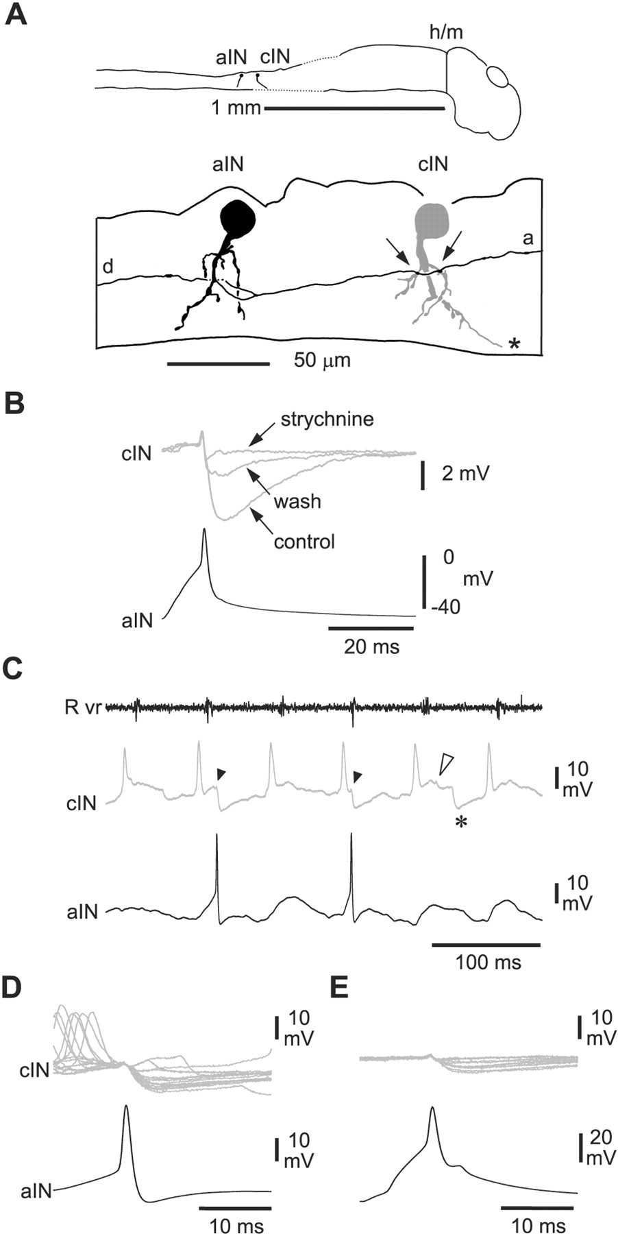 Figure 3. Inhibition from aINs is glycinergic and can produce IPSPs in CPG neurons during swimming. Recordings from an aIN and a cIN. A, Tracings to show the anatomy of an aIN (black) and a cIN (gray) with possible synaptic contacts (arrows) from the ascending (a) axon of the aIN. The aIN also has a descending axon branch (d). The cIN axon is not shown beyond the asterisk, where it crosses the cord ventrally. B, Impulses evoked in the aIN by current injection produce IPSPs in the cIN that are blocked by 5 μM strychnine, with partial recovery on wash. Each trace is the average of seven traces. C, Six cycles of swimming initiated by a current pulse to the skin and monitored from a ventral root on the right side (Rvr). The cIN fires a single impulse and receives IPSPs on most swimming cycles, revealed by injection of depolarizing current (asterisk, mid-cycle IPSP). The aIN fires less reliably. Two early-cycle IPSPs (arrowheads) in the cIN follow spikes in the aIN; another early-cycle IPSP does not (open arrowhead). D, Synchronizing records to the aIN spikes shows short latency IPSPs in the cIN follow most aIN spikes. Note that these IPSPs and the aIN spikes are not similarly time-locked to the preceding cIN spikes. E, IPSPs in the cIN follow spikes evoked in the aIN by current injection at the same latency as those during swimming in D. The IPSPs are smaller than in D because the cIN is less depolarized. |