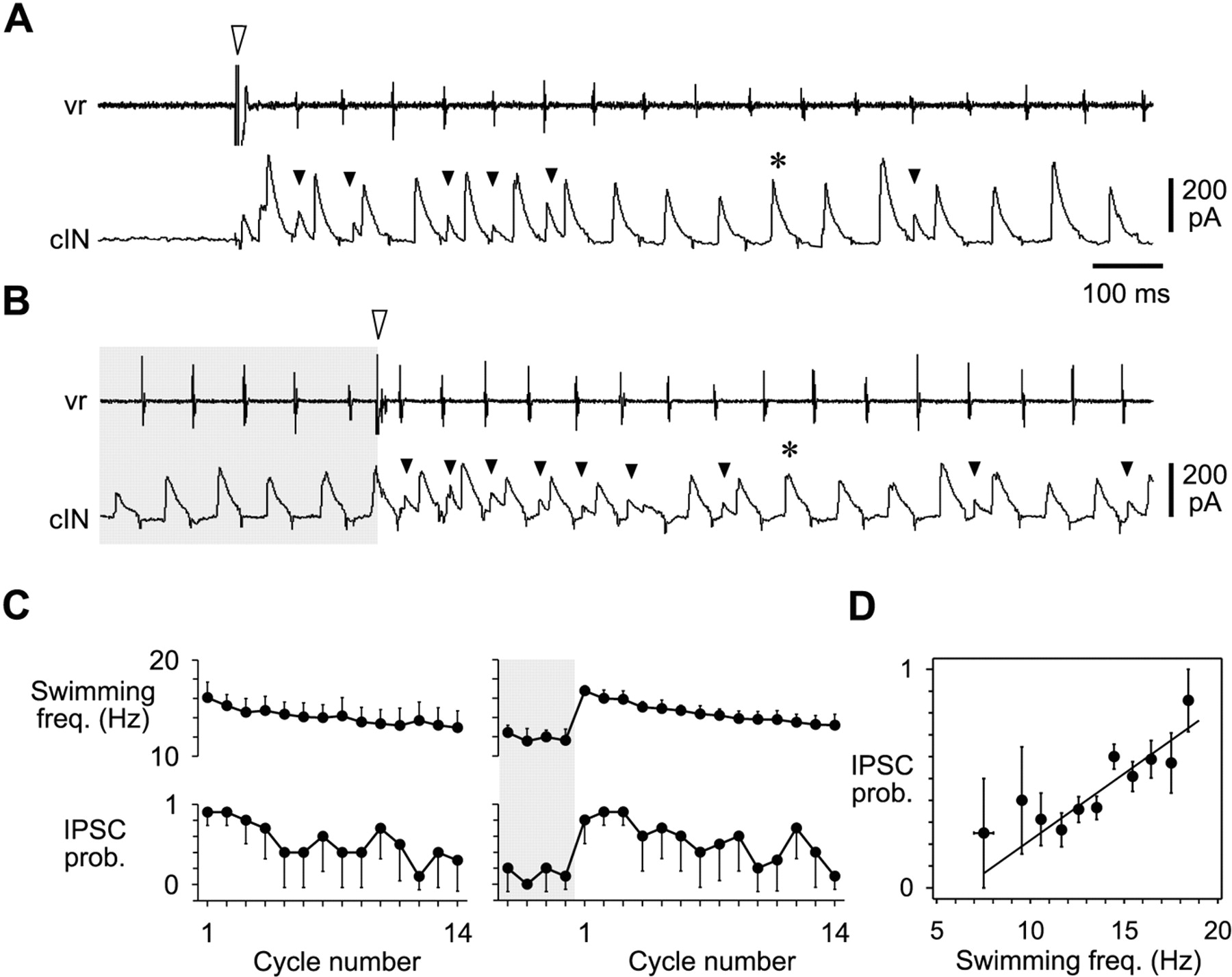 Figure 6. Early-cycle IPSCs occur more reliably at higher swimming frequencies. A, Recording from a ventral root (vr) and a cIN at the start of a swimming episode initiated by a skin stimulus (open arrowhead). Voltage-clamp recordings in the cIN (at a positive holding potential close to EPSC reversal level) show early-cycle IPSCs (arrowheads) when the swimming frequency is highest. These become less reliable as the swimming frequency subsequently falls (asterisk marks a mid-cycle IPSP.) B, Early-cycle IPSCs (arrowheads) in a cIN are more common when the swimming frequency rises after a brief tail-skin stimulus (open arrowhead) applied during swimming. They are absent immediately before the stimulus (shaded region) when the frequency is low. C, Swimming frequency and the probability of recording early cycle IPSCs, plotted for 10 neurons after the start of an episode of swimming (left, as in A) and after a stimulus applied during swimming (right, as in B). D, The probability of recording early-cycle IPSCs increases with swimming frequency. Points represent mean ± SEM for frequency and the proportion of cycles with early-cycle IPSCs for data grouped into consecutive 1 Hz bins (8-10 Hz measurements combined). The regression line was fitted to the raw data (n = 393 cycles; equation: y = 0.06 x - 0.40). |