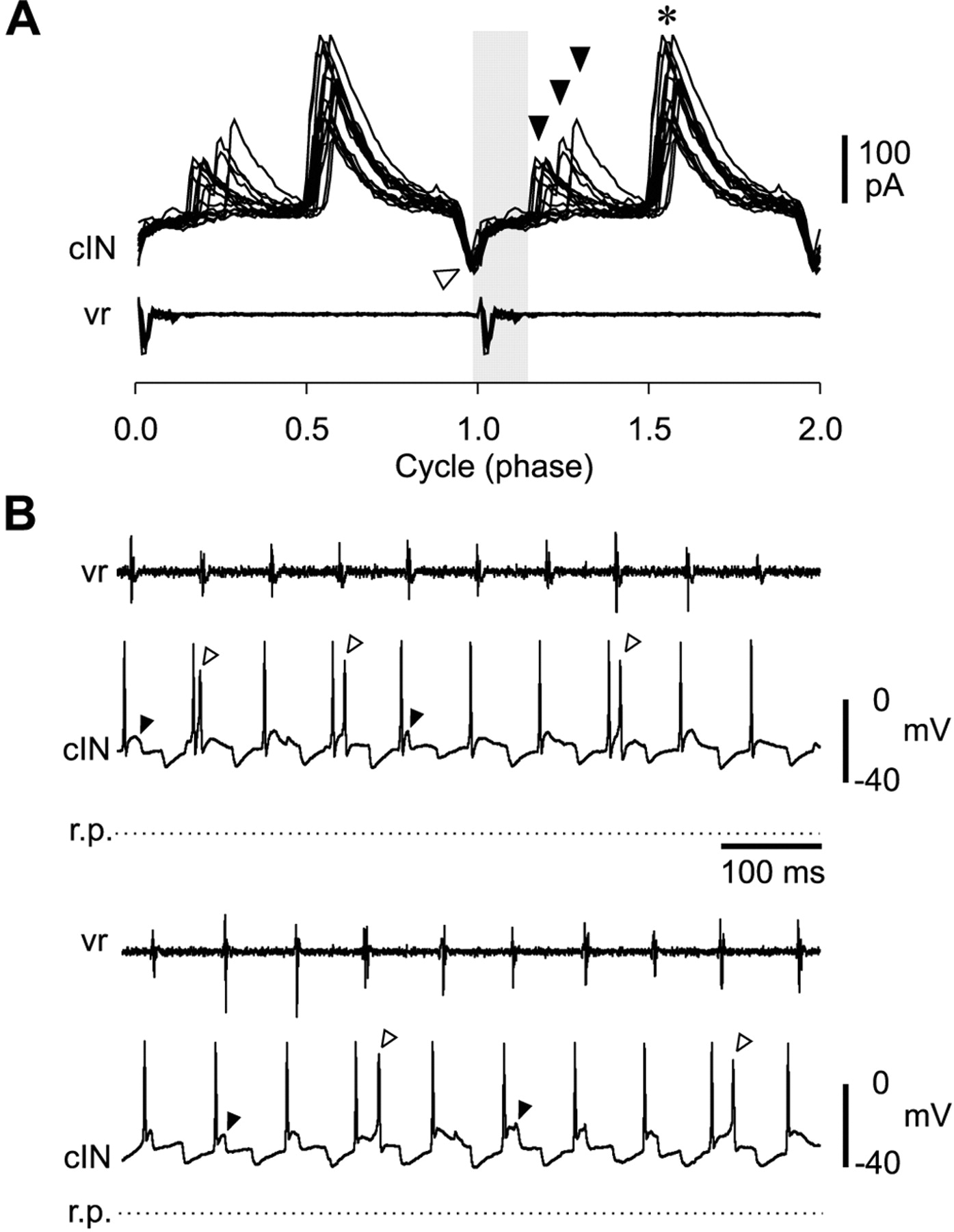 Figure 7. Early-cycle inhibition and control of multiple firing in CPG neurons. A, Voltage-clamp record of a cIN, clamped at a positive potential, to illustrate a typical pattern of inward (excitatory) and outward (inhibitory) PSCs during swimming. The record shows 16 overlapped cycles of swimming (mean period, 69.5 ± 2.1 msec), each normalized to a cycle phase of 1 and plotted twice. Synchronous, âon-cycleâ EPSCs (open arrowhead) just precede the start of the ventral root burst (vr; timing adjusted for longitudinal spacing of electrodes). Early-cycle IPSCs from aINs (filled arrowheads) are delayed relative to the on-cycle excitation and are less synchronized than on-cycle EPSCs or mid-cycle IPSCs from contralateral cINs (asterisk). The shaded region shows the window for impulse firing before early-cycle inhibition. B, Examples of firing activity in two cINs during swimming shown with ventral root activity (vr). Early-cycle IPSPs are present on some cycles (e.g., arrowheads). However, the neurons fire more impulses on cycles where these are absent (open arrowheads). |