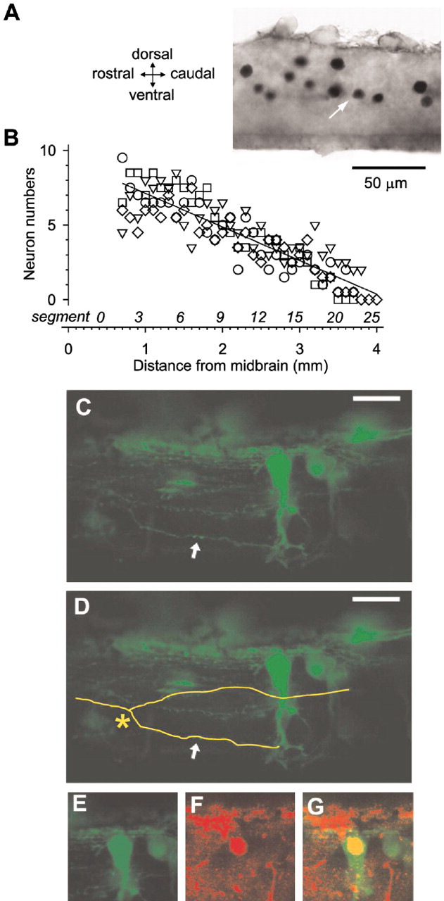 Figure 8. The distribution of En-1-positive neurons. A, En1-positive nuclei of neurons on one side of the whole spinal cord seen in an optical section at 1.5 mm caudal to the midbrain. Dark stained nuclei (e.g., at white arrow) form a column in a middle dorsoventral position. B, The distribution of spinal En1-positive neurons as a function of distance from the midbrain. The plot shows the mean number of neurons (aINs are marked nuclei) on each side for consecutive 0.1 mm blocks in four tadpoles (different symbol for each; regression line: y = 9.37 - 2.25x). C, An aIN with the ascending axon (arrow) clearly visible is labeled by GFP. The neuron is unipolar with dendrites near the point at which the main axonal process turns rostrally. Scale bar, 20 μm. D, aIN in C with ascending axon marked in yellow to show descending branch (at asterisk). E-G, Images of the aIN in C to show the En1-positive nucleus (red) lies within the aIN cell body. |