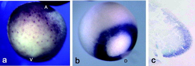 Fig. 1. Expression of AmVegT in axolotl early embryos. (a) Late blastula. Individual cells in the marginal zone expressed AmVegT. Animal pole â A, Vegetal pole âV. (b) Gastrula. AmVegT was expressed in cells surrounding the area where the blastoporal lip forms. There was distinctly less expression at the dorsal lip (D) itself. (c) Gastrula section. A section through the blastoporal lip showed staining in the surface cells.