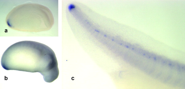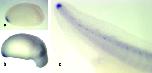 Fig. 2. Expression of AmVegT in embryonic tails. (a) Neurula. Distinct AmVegT staining was present at the posterior end of this neurula. The cranial neural folds are at the anterior end of the embryo, which was cleared following staining. (b) Tailbud. AmVegT was expressed in the tailbud, as seen in this uncleared embryo. (c) Tail expression. AmVegT expression persisted at the tip of the tail in this cleared stage 36 larva. In addition, AmVegT was expressed in cells along the spinal cord, which are likely Rohon-Beard cells.