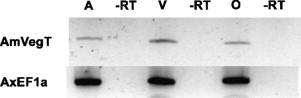 Fig. 3. Expression of AmVegT in axolotl oocytes. Full-grown ovarian oocytes (O) were cut into animal (A) and vegetal (V) thirds. RNA, extracted from oocytes and pooled thirds, was examined for the presence of AmVegT RNA by RT-PCR, using AxEF1α as a control RNA. AmVegT RNA was found in both animal and vegetal pieces. There appears to be somewhat more AmVegT RNA in the vegetal third than the animal third, but this was not consistently seen. (−RT) – control with no reverse transcriptase.