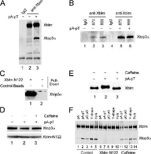 Figure 4. Xblm interacts with Xtop3α in a regulated manner. (A) Control (lane 1) and anti-Xblm (lanes 2 and 3) antibodies on protein A beads were incubated in extracts in the absence (lanes 1 and 2) or presence (lane 3) of pA-pT. The beads were collected and immunoblotted for Xblm and Xtop3α. (B) Control antibodies (lanes 1 and 4) and two different anti-Xblm antibodies (#870, lanes 2 and 5; #868, lanes 3 and 6) on protein A beads were incubated in extracts in the absence (lanes1–3) or presence (lanes 4–6) of pA-pT. The beads were collected and immunoblotted for Xtop3α. (C) His6-tagged Xblm-N122 on nickel beads and blank nickel beads were incubated in interphase egg extracts. The beads were collected and immunoblotted for Xtop3α. (D) Xblm-N122 on nickel beads was incubated in extracts containing no DNA (lane 1), pA-pT (lane 2), or pA-pT plus caffeine (lane 3). The beads were collected and immunoblotted with anti-Xtop3α and anti-His6 antibodies (to detect Xblm-N122). (E) Egg extracts were incubated with no DNA (lane 1), pA-pT (lane 2), or pA-pT plus caffeine (lane 3) and were immunoblotted for Xblm. (F) Anti-Xblm antibodies on protein A beads were incubated in extracts in the presence of different oligonucleotides. In some cases, either purified Xblm-N122 (lanes 6–10) or caffeine (lanes 11–14) was also added. After 2 h, the beads were collected and immunoblotted for Xblm and Xtop3α. |